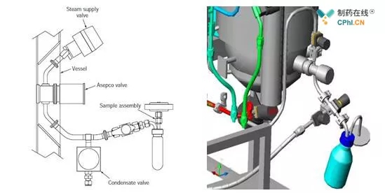 生物反應(yīng)器的生物安全等級(jí)(BL)由較終用戶依照相關(guān)標(biāo)準(zhǔn)制定,各房間的操作要求(例如取樣廢氣排放,凝聚物和培養(yǎng)基廢棄處理)都要保證操作者和環(huán)境的安全。根據(jù)病原對(duì)微生物活細(xì)胞的危險(xiǎn),生物安全等級(jí)(BL)分成3個(gè)安全等級(jí)空間,包括BL1-LS、BL2-LS和BL3-LS,病原危險(xiǎn)越高、在設(shè)計(jì)和設(shè)備運(yùn)行時(shí)要求房間的安全等級(jí)就越高。對(duì)于等級(jí)BL2和BL3的產(chǎn)品,添加輔料、取樣和收獲需使用密閉操作系統(tǒng),污染凝聚物需收集到指定的滅活罐進(jìn)行后續(xù)處理,培養(yǎng)結(jié)束后,生物反應(yīng)器的罐體和管道需得到及時(shí)的清洗與滅菌處理。為避免取樣操作帶來雜菌污染,側(cè)壁取樣閥需采用封閉的取樣裝置(圖2)。